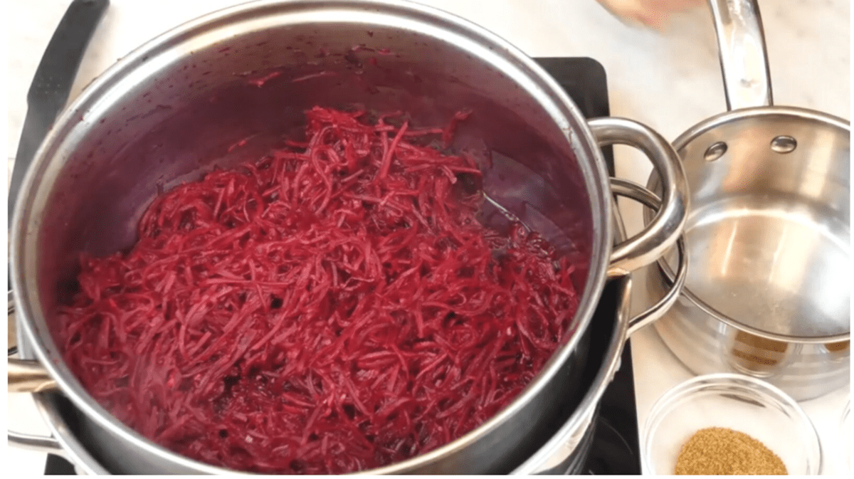 До підготовленого буряка додаємо подрібнений або пропущений через прес часник, всипаємо сіль і цукор, вливаємо оцет і ретельно перемішуємо. Після цього перекладаємо масу в каструлю та ставимо її на водяну баню. Прогріваємо приблизно 30 хвилин, періодично помішуючи. У результаті буряк стане м’якшим, але збереже легку хрумкість і насичений смак.