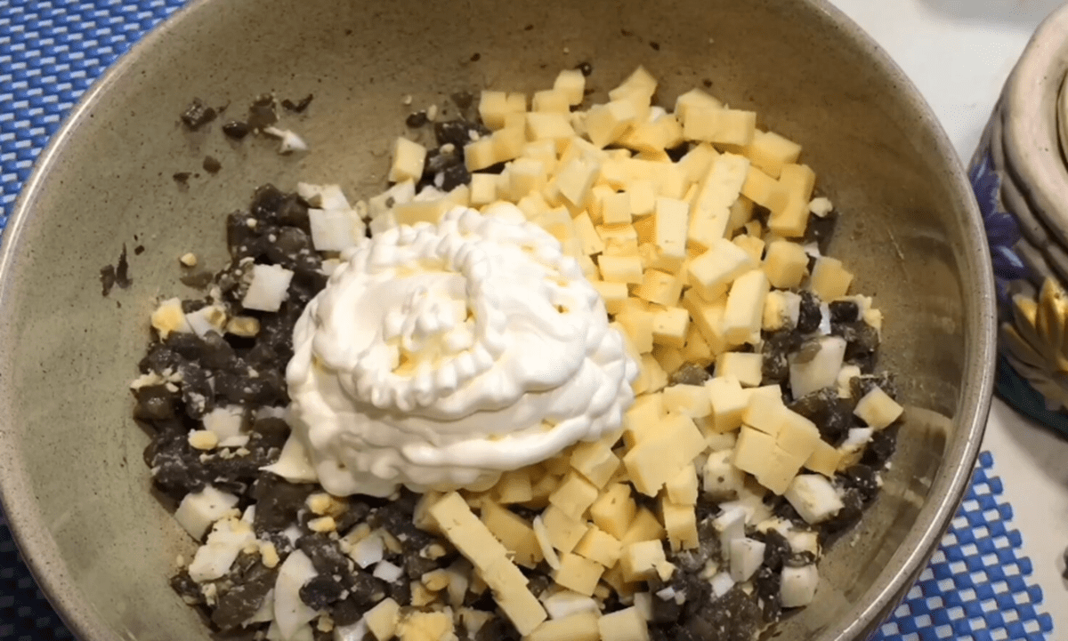 Яйця відваріть заздалегідь, охолодіть і наріжте кубиком. Перекладіть їх у миску, додайте остиглі гриби з цибулею. Твердий сир також наріжте невеликими кубиками і додайте до інших інгредієнтів.