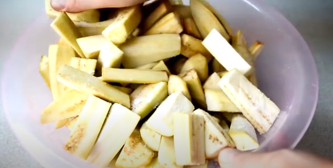 Робиться все дуже просто – нарізаються овочі та проварюються. Баклажани обчистьте від шкуринки. Можете нарізати кружальцями завтовшки десь 1,5 см. Але краще зробити брусочки – так вони у готовій страві не розваляться.