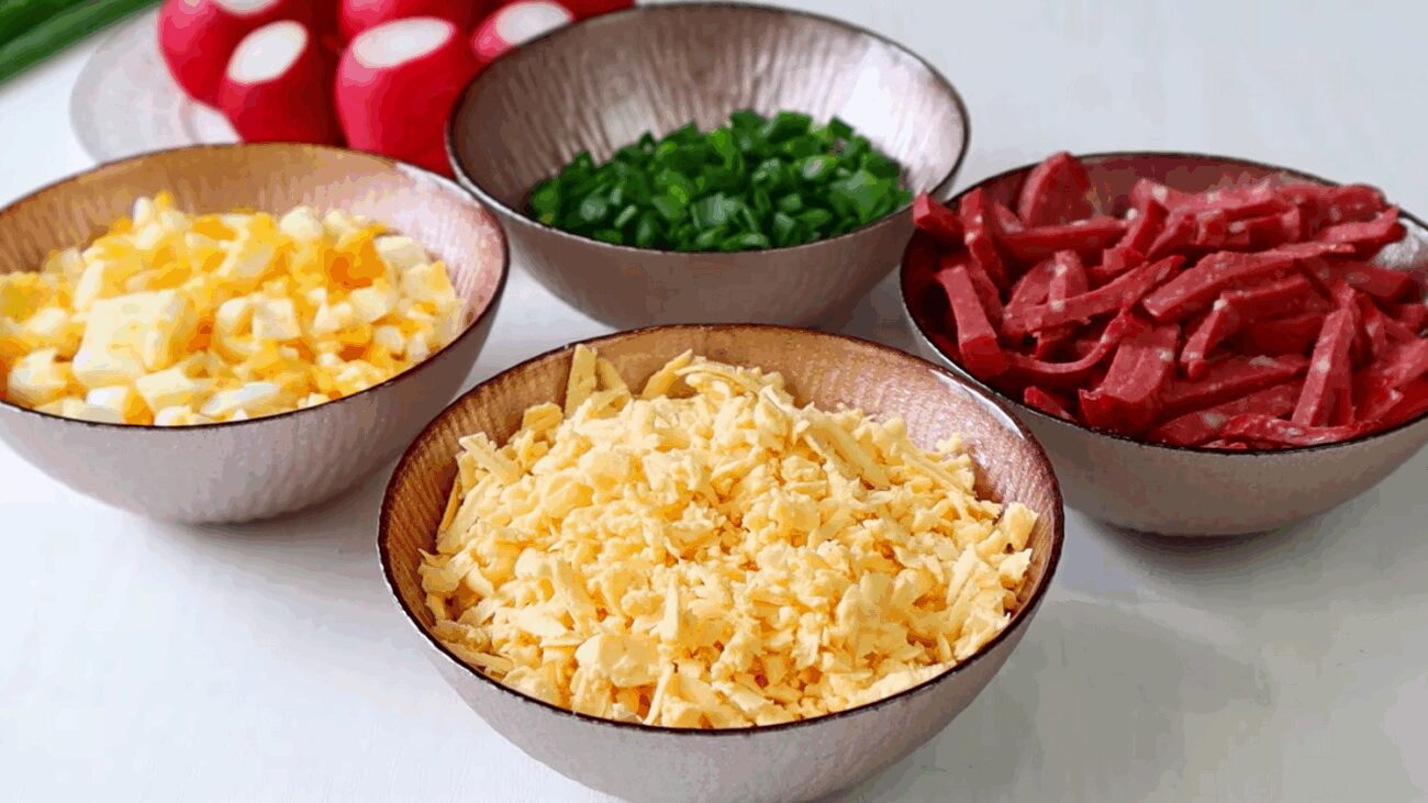 Класичний спосіб — усе змішати в мисці. Поріжте кубиками 150 г редиски, 100 г твердого сиру, 200 г копченої курки, ковбаси чи шинки. Додайте подрібнений пучок зеленої цибулі — він дає ту саму весняну нотку. Змішайте все в мисці, заправте майонезом і, якщо бажаєте, додайте трішечки чорного меленого перцю. Сіль можете не класти — ковбаса та сир самі дадуть потрібну солоність.