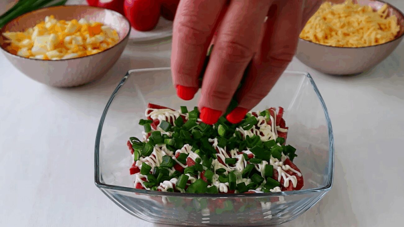 Якщо хочеться зробити салат святковішим, можна викласти всі інгредієнти шарами. Спочатку викладіть ковбасу або курку, далі яйця, потім редис, сир і зверху зелену цибулю. За бажанням чергування шарів можна змінювати. Наприклад, покласти цибулю всередину, а редис — зверху.