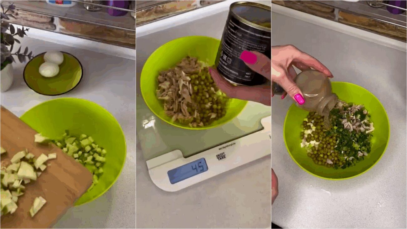 Починається все з 4 яєць. Їх потрібно відварити, охолодити й почистити. Після цього наріжте яйця дрібним кубиком та додайте до них баночку консервованого горошку. Якщо у вас горошок лише у великих банках, то відважте 300 г. І не забудьте відцідити всю рідину, інакше салат буде водянистим.