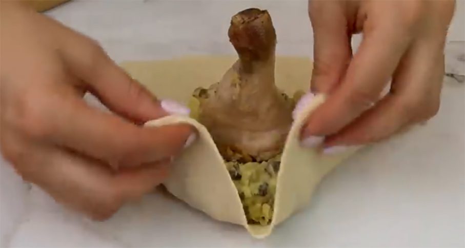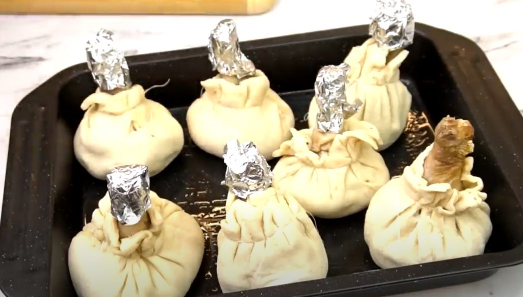 Поставте курячу гомілку й сформуйте з тіста мішечок, затягнувши ниткою, щоб не розкрився під час запікання. Деко змастіть олією. Викладіть усі підготовлені мішечки, попередньо обгорнувши кінчики ніжок фольгою. Поставте до розігрітої до 200 градусів духовки. Випікайте 30 хвилин. Перед подачею нитки зніміть.