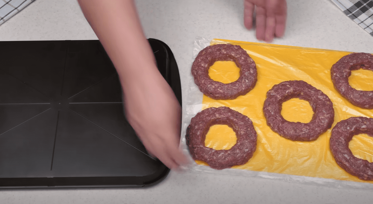 Фарш, до якого вже додали цибулю, часник та замочений білий хліб розділити на 10 рівних порцій. Формуємо кільця однакового розміру на поліетиленовому пакеті чи пластиковій дошці. По суті, ми робимо заготівлі, які потім відправимо в морозилку. Їх можна зробити заздалегідь, щоб перед приходом гостей заощадити час.