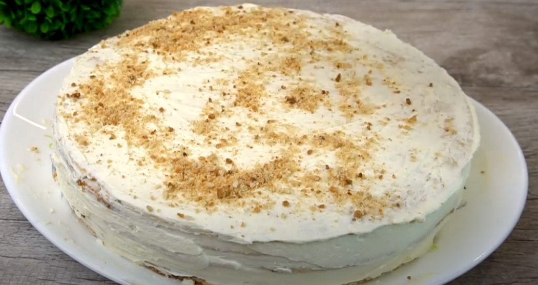 На кожен корж викладайте потроху крему – по 1 ст.лож. Коли змастите всі, крем, що залишився, розподіліть по верху та боках горіхового торта. Щоб коржі просоталися, буде достатньо 2 годин.