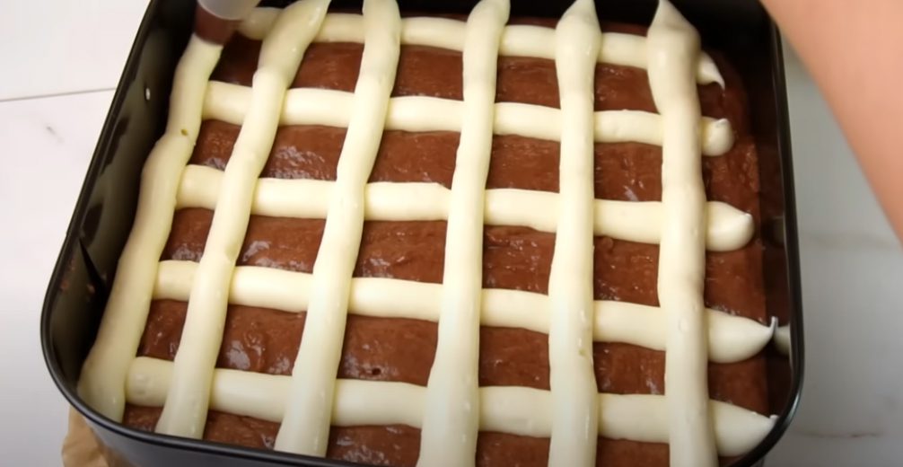 Викладіть у мисочку сир, вбийте яйце, всипте крохмаль та цукор. Перемішайте, щоб маса стала однорідною. Перекладіть сирну суміш у кондитерський мішок. Форму вистеліть пергаментом і вилийте шоколадну основу.