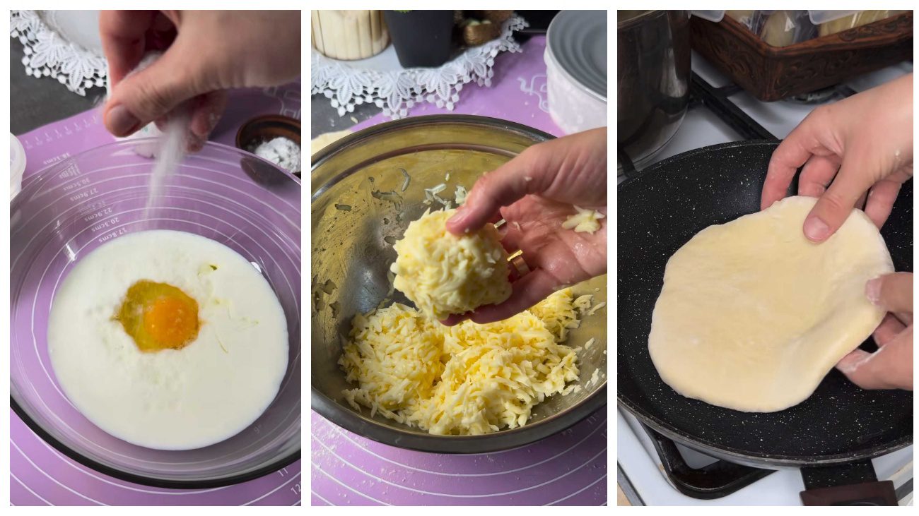 Наступний крок — взяти сир. Це може бути сулугуні або моцарела. Натерти його на крупній терці у глибоку та широку миску, щоб це було зручно. Розбити в цей тертий сир яйце, перемішати й сформувати чотири кулі. Далі розкачати чотири кружечка тіста, на кожен по центру викласти по одній сформованій кульці з сиром, потім добре защіпнути, а зверху розкачати скалкою. Таким чином, вийде що сир опиниться в середині “млинця з тіста”. Смажити хачапурі слід на сухій сковороді з обох боків. Гаряче хачапурі слід одразу ж змастити маслом! І все — хачапурі готові на 100%!