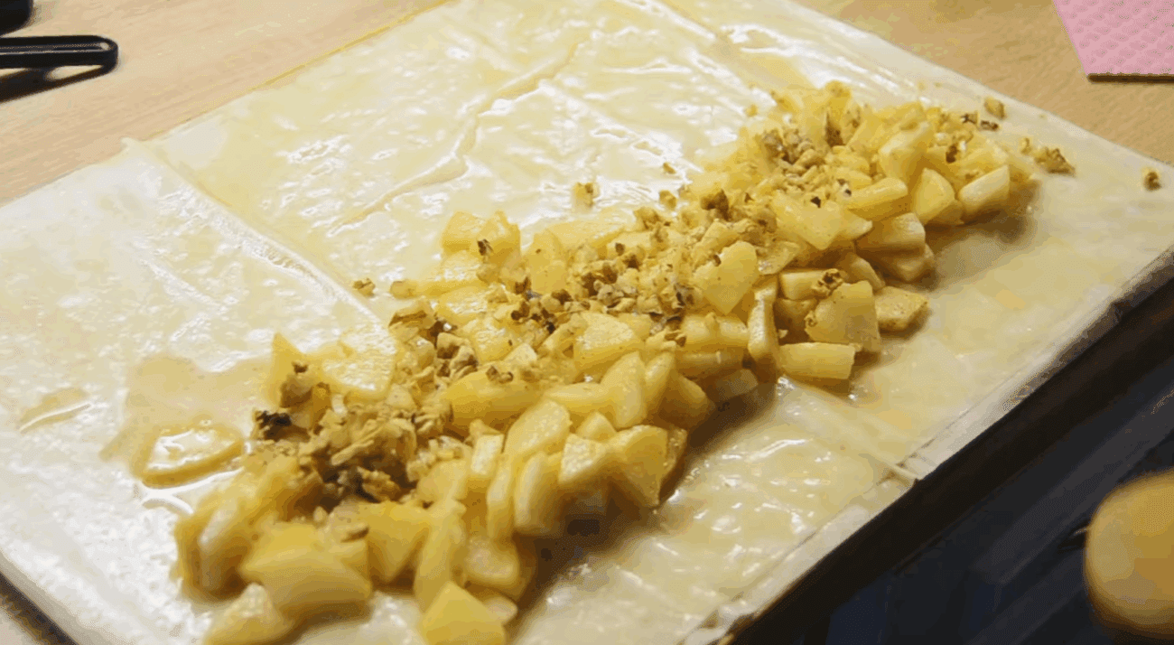 Беремо тісто філо. Хз знадобиться 3 шари. 1 шар тіста змащуємо вершковим маслом і викладаємо на нього другий шар тіста. Його також змащуємо вершковим маслом і викладаємо третій шар тіста. Третій шар тіста також змащуємо вершковим маслом і на верх викладаємо тушковані яблука.
