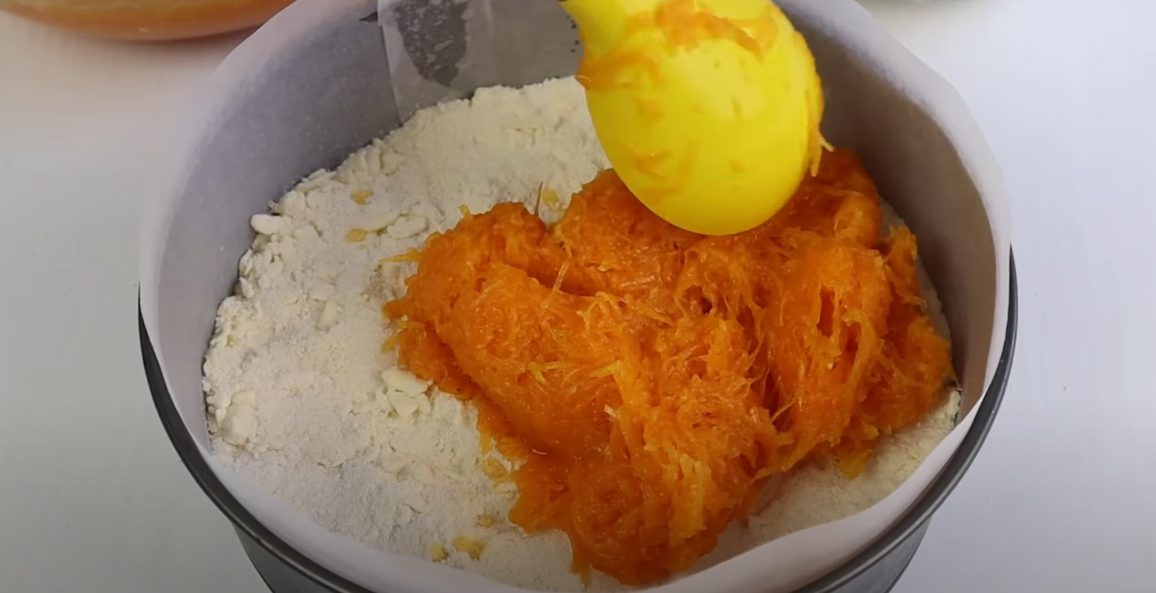 Гарбузовий пиріг за цим рецептом виходить дуже ніжним. Це навіть можна назвати тортиком. Обчистьте шматочки гарбуза та натріть на дрібній тертушці. Додайте до помаранчевого овочу цукор та цедру лимона. А ще вичавіть сік і теж влийте у масу.