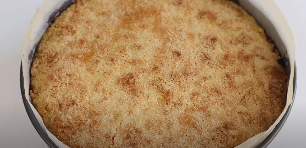 Перетріть руками з сухою сумішшю. Зберіть докупи. Мають залишитися крихти – це правильно. Форму 22 см у діаметрі вистеліть пергаментом. Вкладіть на дно третину тіста. Легенько притисніть ложкою.