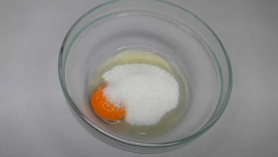 Пиріг без духовки приготувати дуже просто. Вбийте у мисочку яйце. Додайте сіль, цукор – звичайний та ванільний. Перемішайте вінчиком до однорідності. Влийте молоко та олію. Ще раз усе ретельно перемішайте.