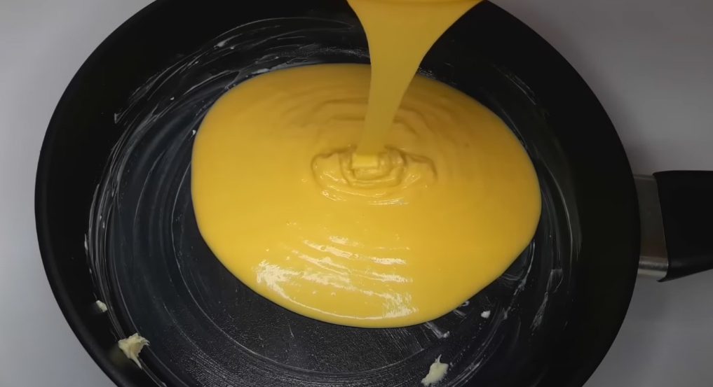 Борошно змішайте з розпушувачем та просійте. Починайте потроху додавати в яєчну масу, не перестаючи перемішувати. Грудочок у масі не повинно бути. Холодну пательню змастіть шматочком вершкового масла.