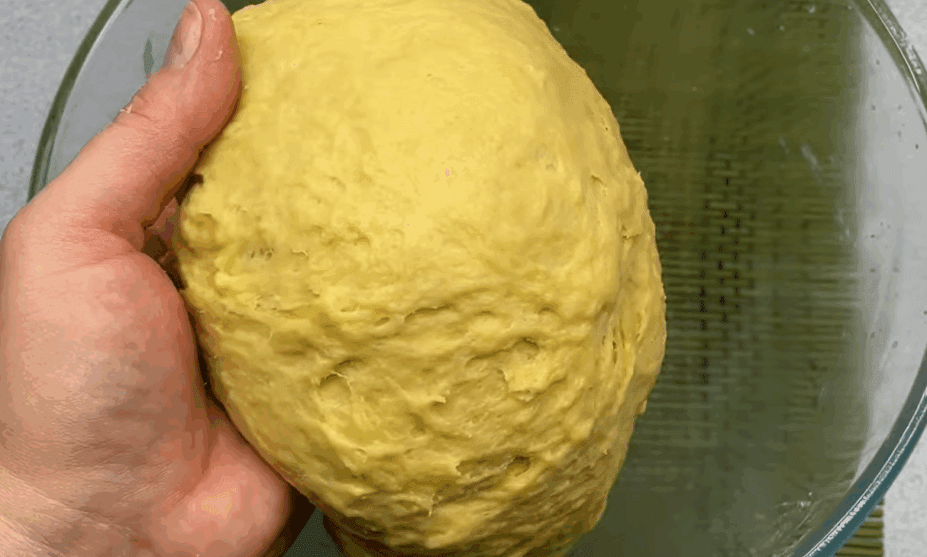 Готове тісто виходить м’яким і зовсім трішки липне до рук. Накриваємо тісто рушником і залишаємо підходити в теплому місці на 1 годину.