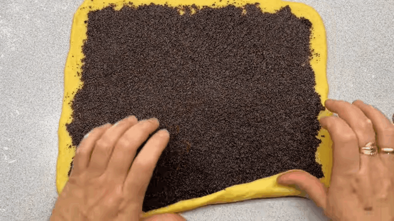 Далі кожен шматок тіста розкачуємо у тонкий пласт. На розкачене тісто викладаємо макову начинку і закручуємо у рулетик.