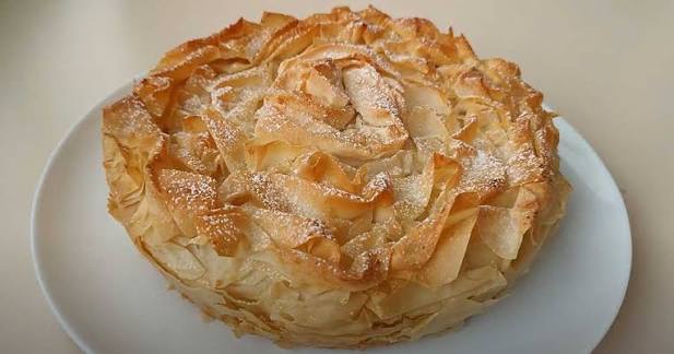 На відміну від класичної шарлотки, цей пиріг виходить більш ніжним, ароматним і хрустким завдяки тонкому листовому тілу філо. Його смак ідеально поєднує солодкі яблука, легку кислинку та карамелізовану скоринку.