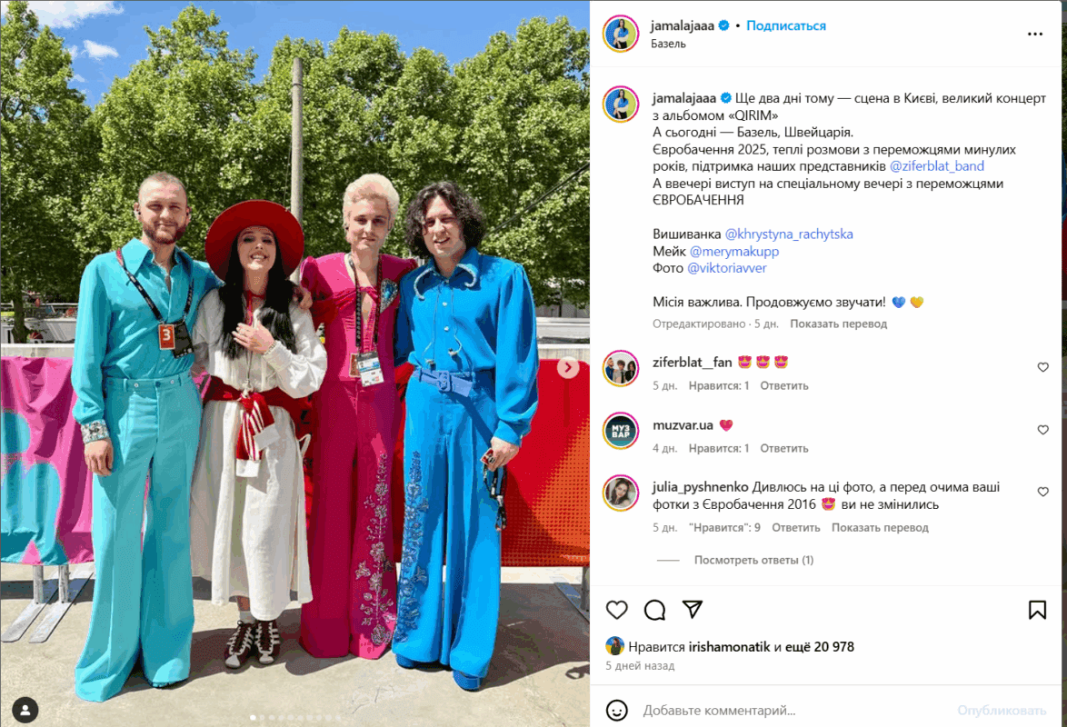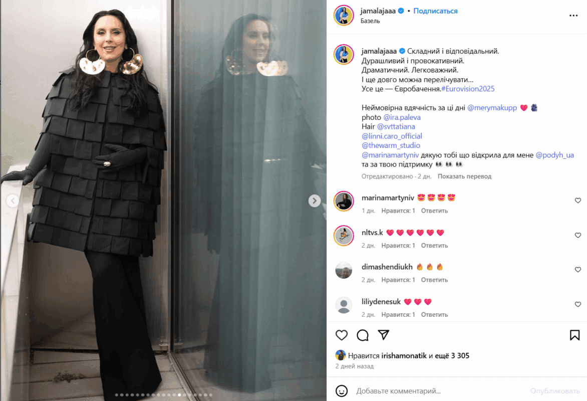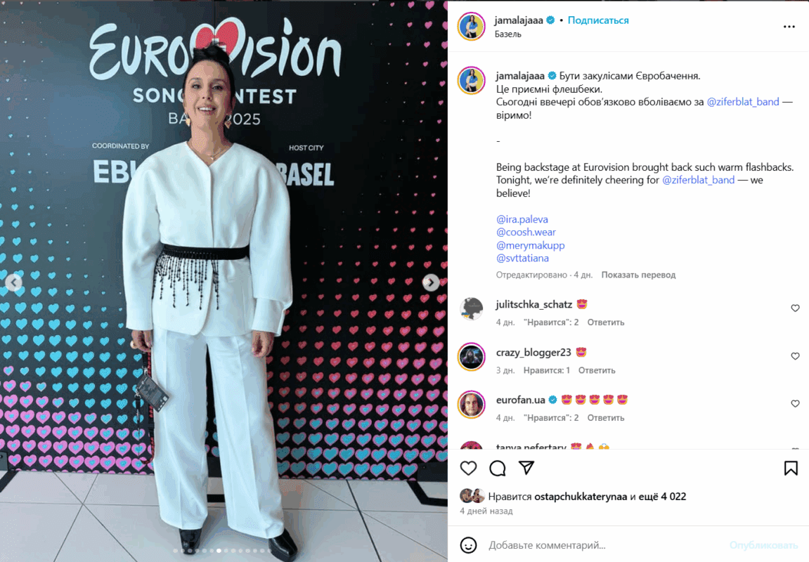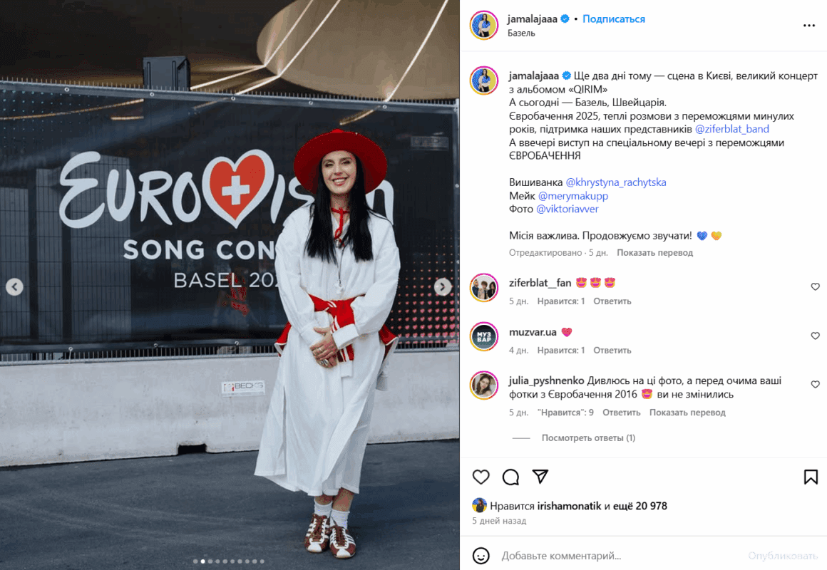 У суботу, 17 травня, у швейцарському місті Базелі пройшов гранд-фінал міжнародного конкурсу “Євробачення 2025”. Україну цього року представляв гурт Ziferblat. Підтримати музикантів приїхала переможниця “Євробачення 2016” популярна українська співачка Джамала. Днями артистка оприлюднила докладний фотозвіт, на якому було знято її виступ та зустрічі із зірками та учасниками конкурсу. Але найбільше користувачів Мережі привернули увагу її оригінальні та дуже креативні образи.