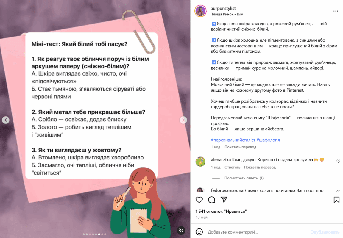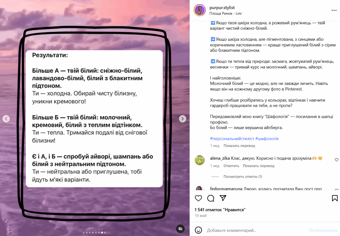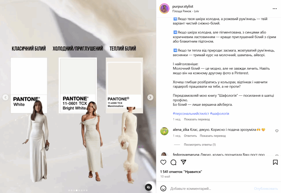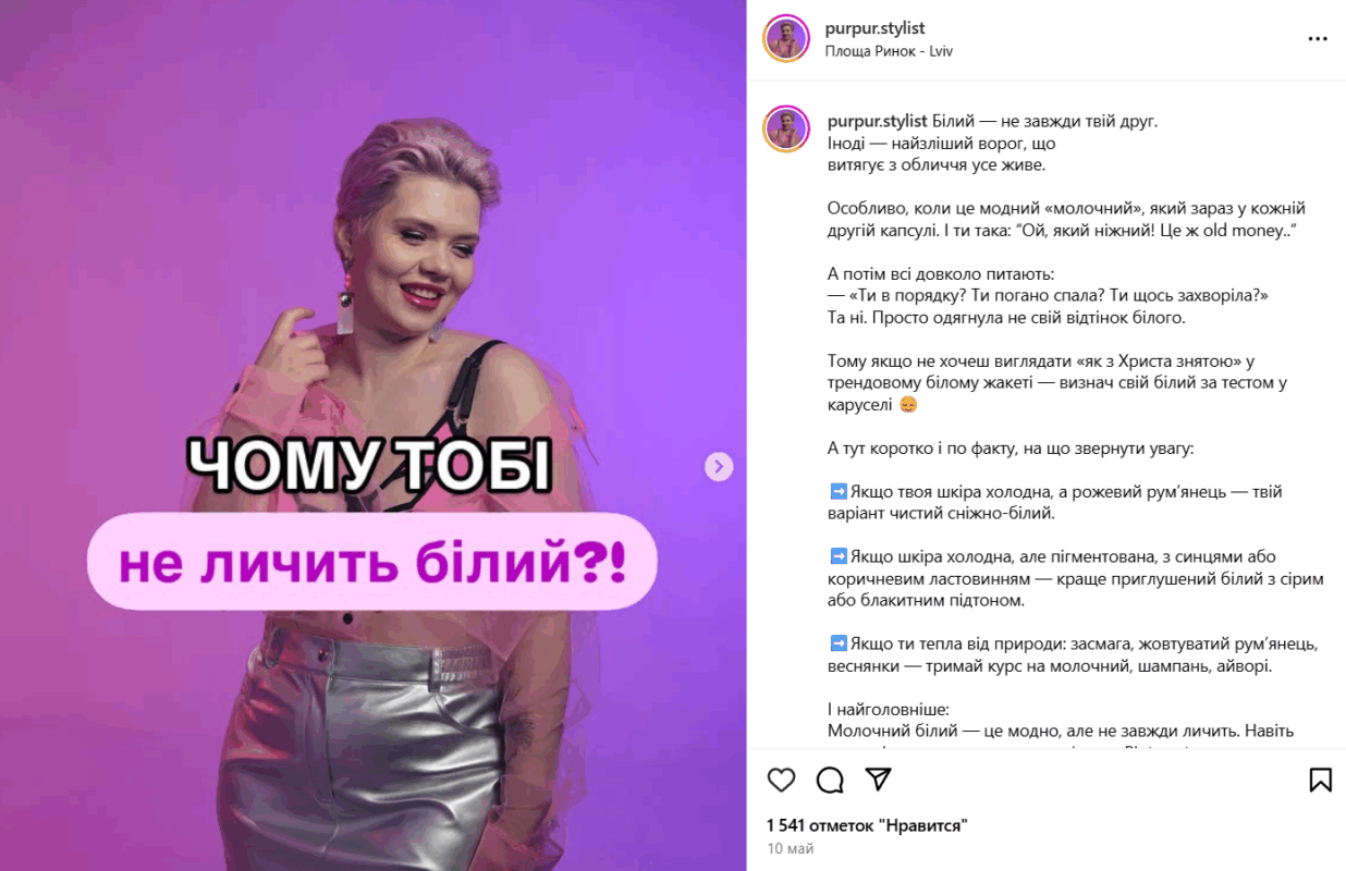 Молода стилістика зі Львова Олена Шевченко вже давно веде блог у соціальній мережі Інстаграм, де ділиться зі своїми підписниками порадами та лайфхаками на різні теми щодо моди та стилю. Нещодавно дівчина дала рекомендації, як за допомогою різних відтінків зробити свою зовнішність візуально свіжою і молодшою. А зараз Олена вирішила продовжити цю тему та розповіла про білий колір, який, як з’ясувалося, йде далеко не всім.