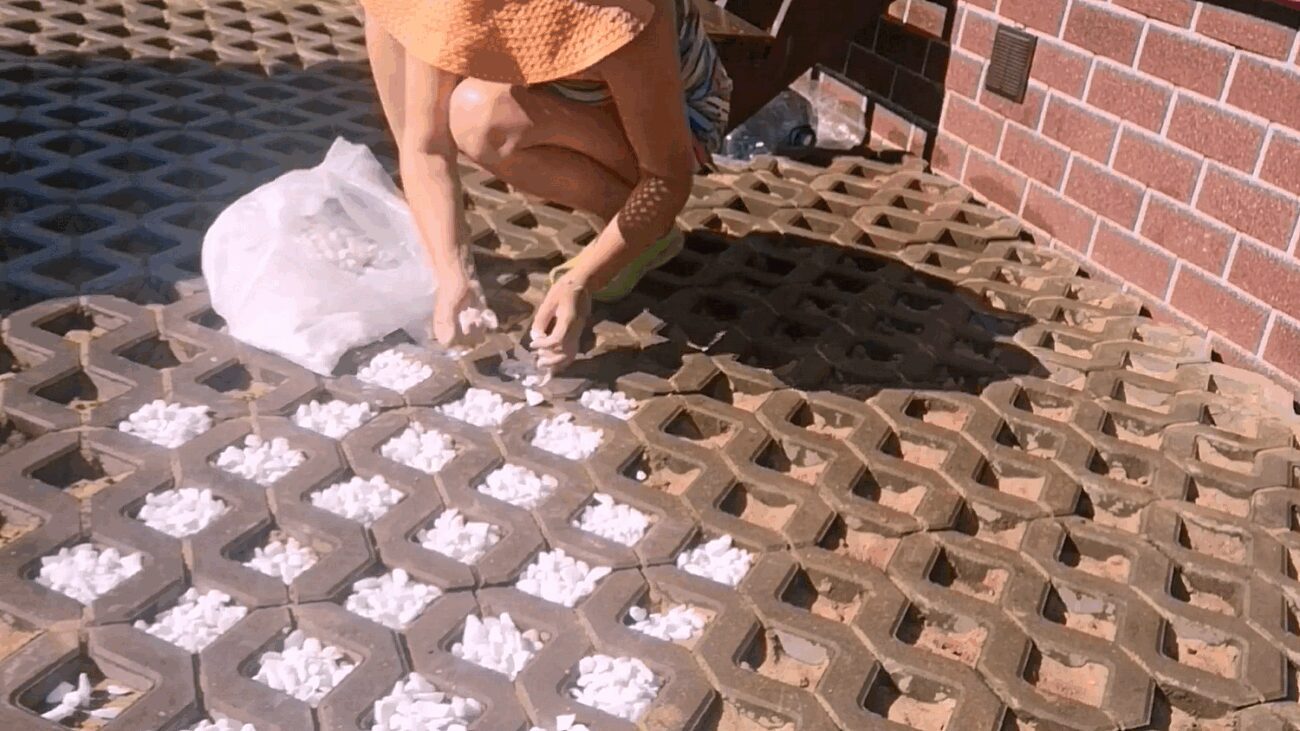 Деякі господарі розбивають екоплитку на зони, кожну оформлюючи різними способами. Наприклад, замість газону можна помістити всередину красиві камінчики. Але основою також є пісок. Спочатку його необхідно засипати в плитку та зачекати, поки він утрамбується. Потім потрібно зверху трішки забрати піску, все гарно почистити та засипати камінчики. Важливо, щоб вони були зовсім трішки нижче рівня плитки.