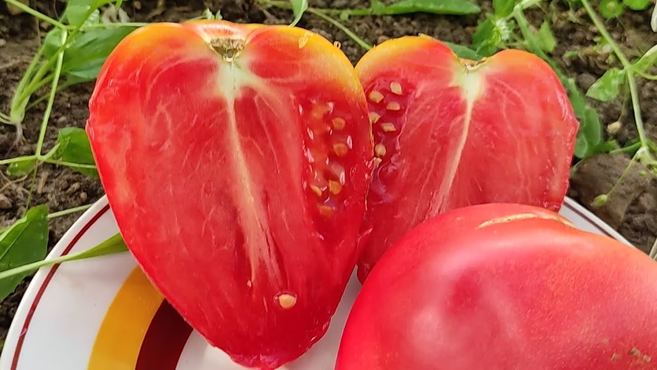 Томати сорту “Рожевий мед” ростуть досить великими: 300-500 г один плід, а окремі екземпляри можуть досягати до 1 кг. Форма у них плоско-округла і злегка видовжена, колір – насичено-рожевий. Смак помідорів цього сорту солодкий, насичений і яскравий.
