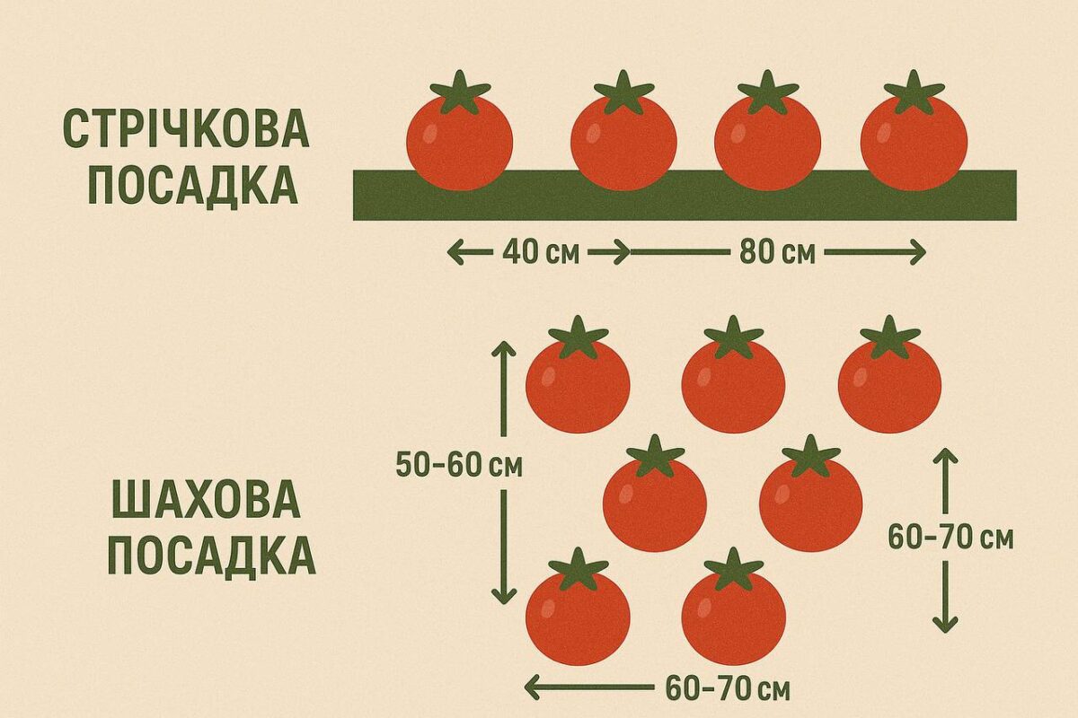 Дані схеми посадки підходять як для вирощування томатів в парнику, так і для вирощування у відкритому грунті.