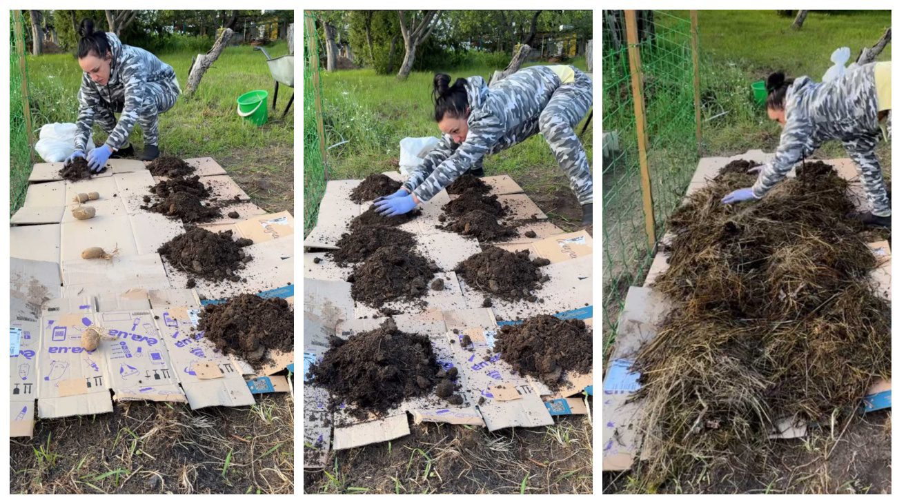 Так, перше, що варто зробити, це взяти пусті картонні коробки й розрізати їх так, щоб це був максимально довгий прямокутник із картону. Цей спосіб називається: “Як посадити картоплю не зариваючи її в землю”. Так, ці картонні прямокутники садівниця просто розклала по всій пустій ділянці, яку обрала саме під висадку картоплі. Далі вона взяла й розклала на картоні картоплю (робила це з певною рівномірною дистанцією). Зверху засипала цей картон із розкладеною картоплею землею, а поверх цього поклала компост.