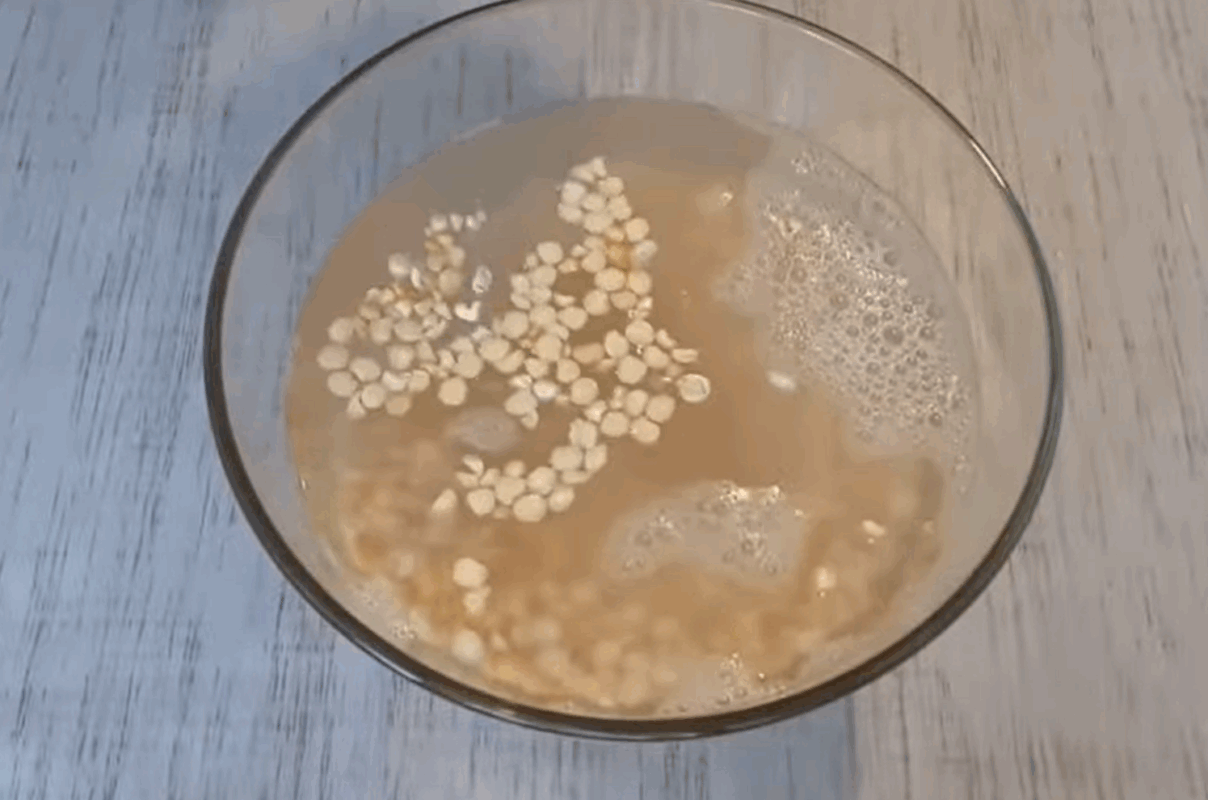 Для приготування також підживки вам знадобиться звичайний жовтий колотий горох, який ви використовуєте для супів. Візьміть 1 склянку гороху, пересипте у літрову банку і заповніть банку до верху водою та перемішайте. Залиште отриману суміш в теплому місці на добу. За цей час горох почне бродити і активізуються всі його корисні речовини та вітаміни.