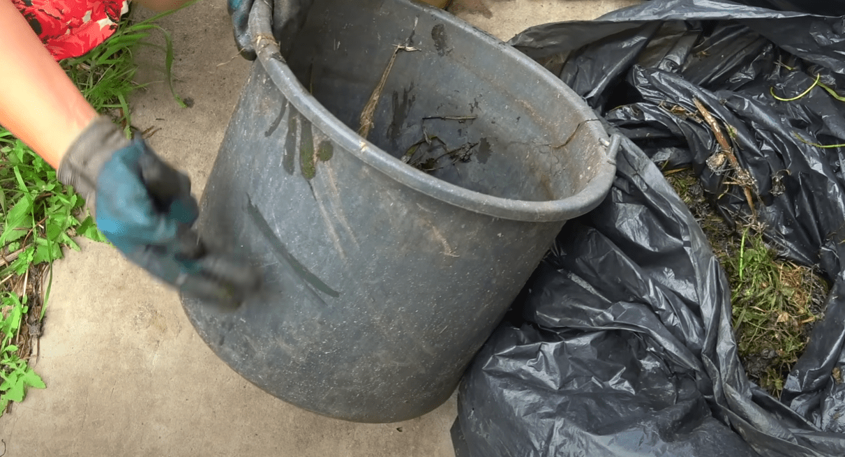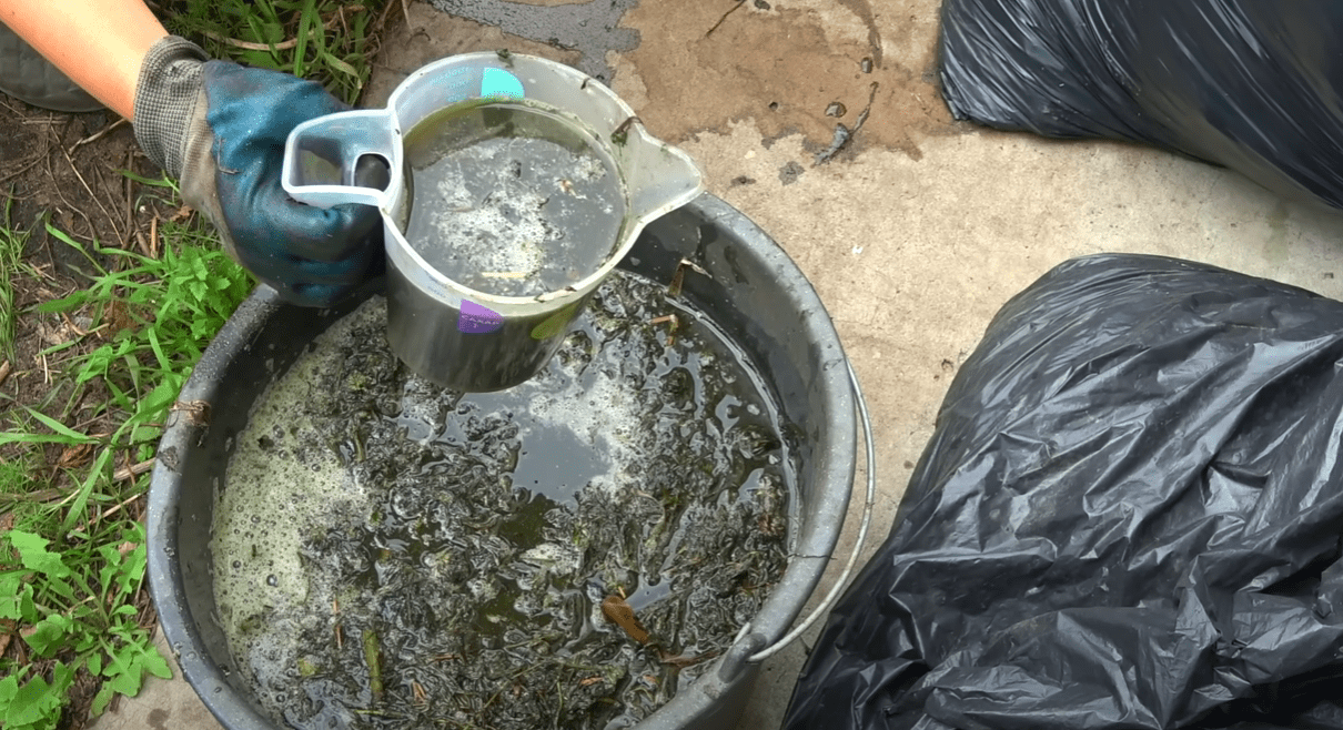 Після ферментування приступаємо до приготування добрива. Вам потрібна будь-яка велика ємність. Це може бути відро. Бажано із пластику. Наповнюєте його травою приблизно на ⅔ або половину і заливаєте відстояною теплою водою. Після цього чай повинен настоятися протягом 2 годин, щоб трава віддала всі свої корисні речовини. Підживлення використовують у нерозбавленому вигляді. Ви просто наливаєте її в лійку та поливаєте всі свої рослини. по 1 літру не кущ.