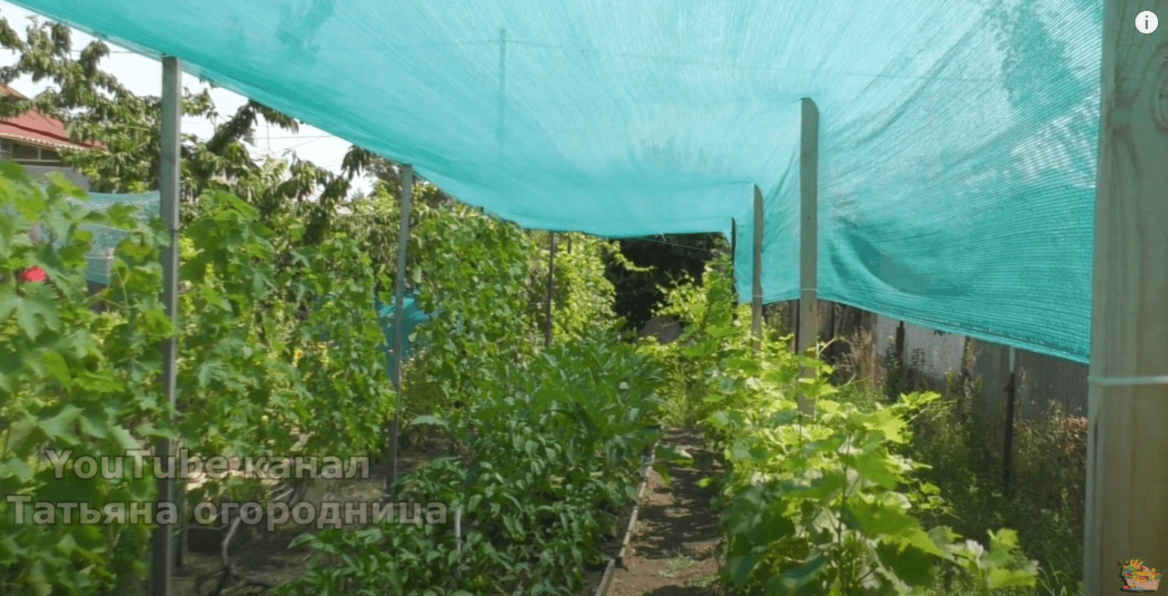 Найпростіший спосіб уникнути сонячних опіків на перці – це в момент утворення зав’язей притінити посадки. Особливо слід приділити увагу сонячній стороні. Краще використовувати спеціальні сітки, які зараз є у продажу в будь-якому садівничому магазині. Зверніть увагу, у сіток різний відсоток затінення. Тетяна на своїй ділянці використала матеріал 80%. Вона досить високо підвішена над грядкою та добре закриває їх від сонця.