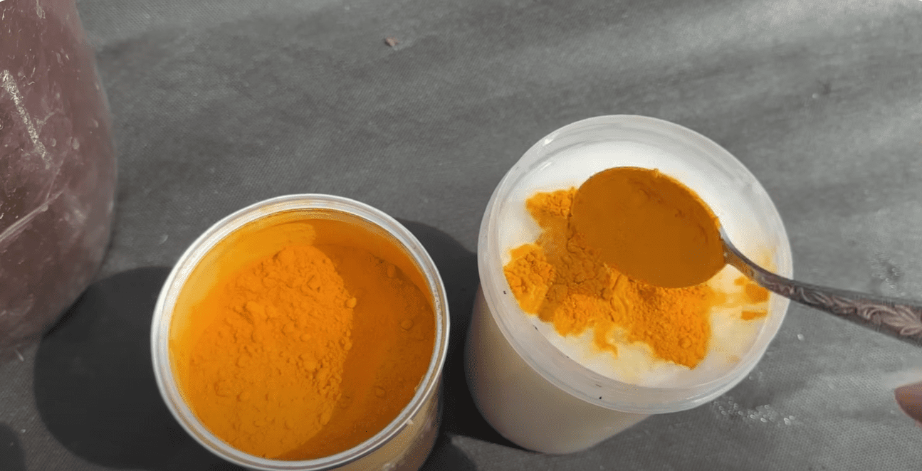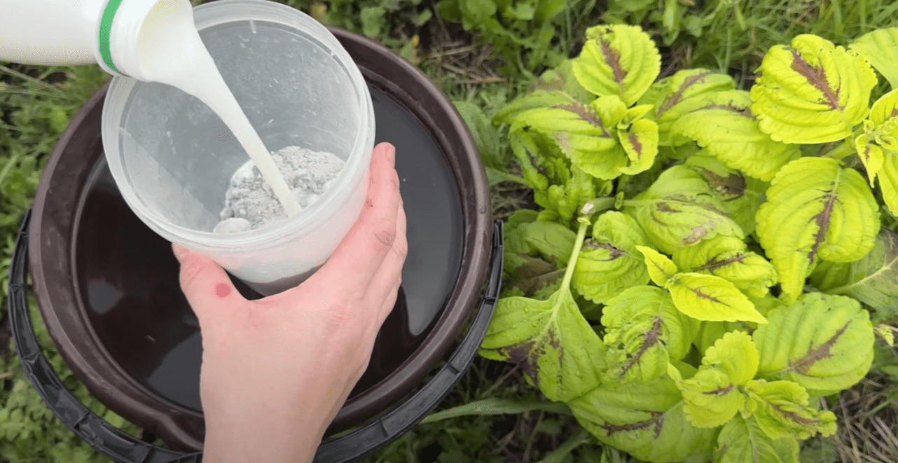 Беремо 1 л молока невеликої жирності 2,5%, 1 ст. ложку сухого часнику, 1 ст. ложку куркуми з багатим вмістом калію, магнію, заліза та інших корисних елементів. Все це потрібно додати в 10 л води та обприскувати по листу (якщо в обприскувачі немає фільтра, то розчин слід перед застосуванням процідити).
