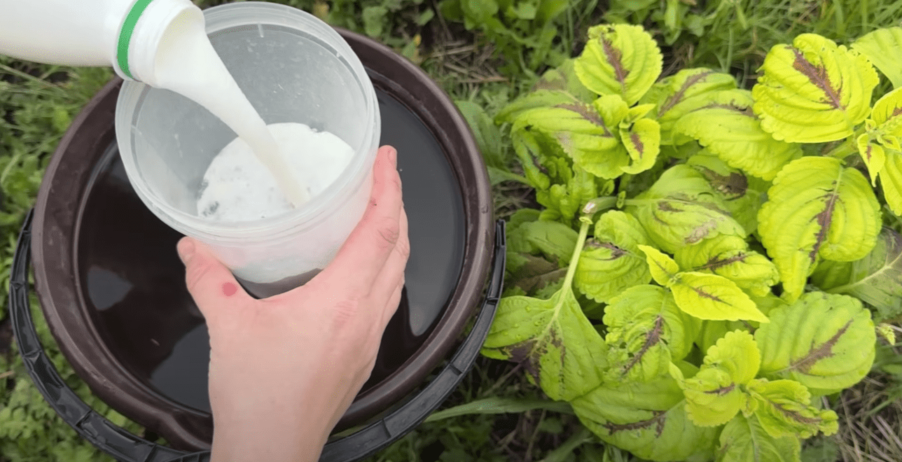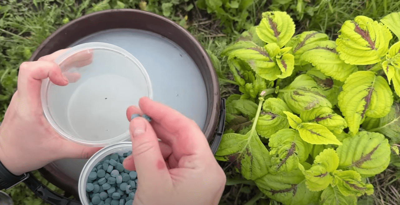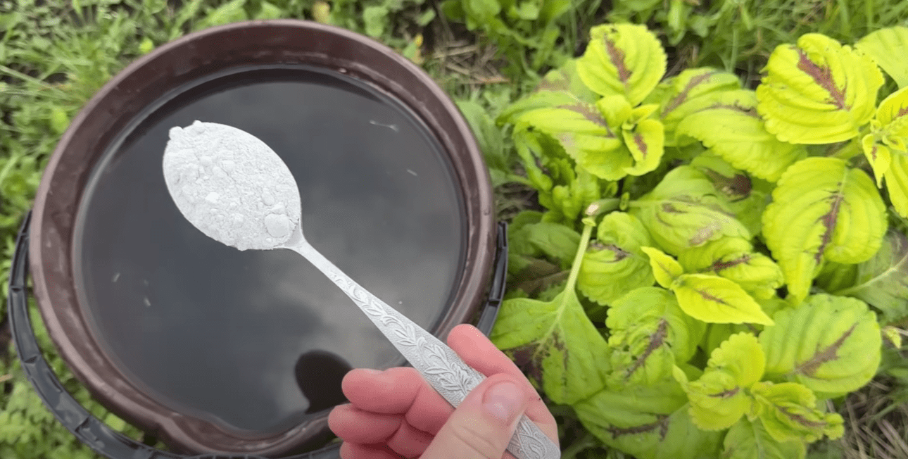 До складу першого підживлення під корінь входять 3 ст. ложки золи соняшнику, полошений 200 мл 9% оцту та 200 мл кефіру. Найкраще брати кефир, який уже почав бродити. Можна просто поставити його на сонячне місце і за кілька годин він дійде до потрібної кондиції. Все це виливаємо у 10 л відро з водою. Туди ж додаємо 10 т спіруліни. Якщо у вас у вигляді порошку, то беремо максимальну дозу – 1 ст. ложку. Добре перемішуємо та залишаємо на 20 хвилин.
