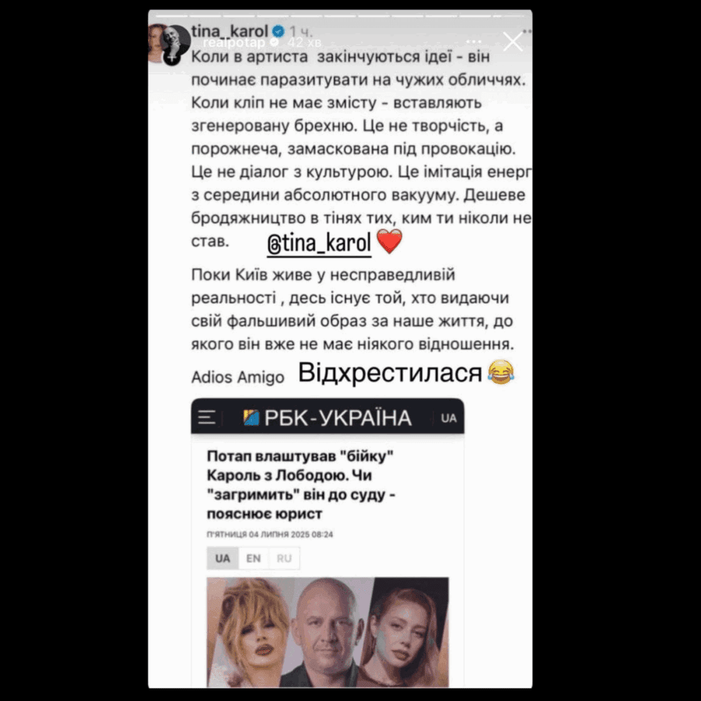 Потап публічно відреагував на реакцію Тіни Кароль на його творчість