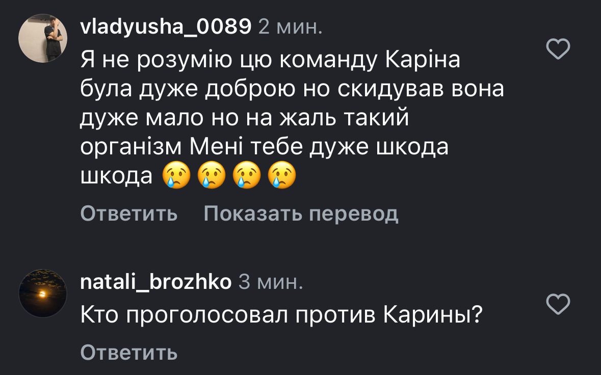 Але кожного тижня все одно вибиває учасник, і на цей раз це була Карина Колесникова. Публіка здебільшого відреагувала на це спокійно, хоча підкреслила, що дівчина дійсно досягла певних результатів, і можливо зможе добитися своїх цілей.