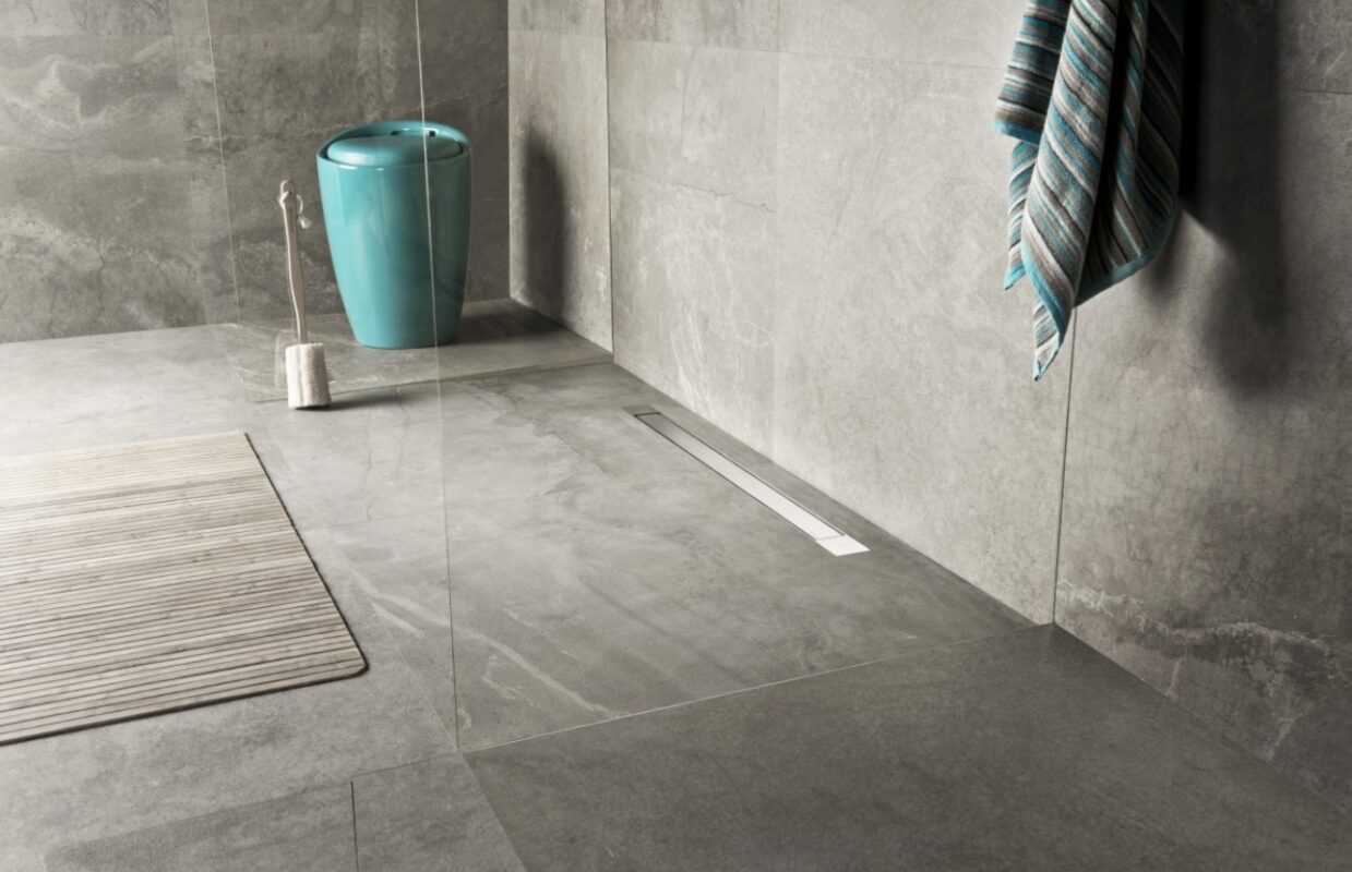 Основою є якісна гідроізоляція та правильний ухил підлоги. Найчастіше використовують великоформатну плитку або мікроцемент, щоб створити ефект суцільної поверхні.