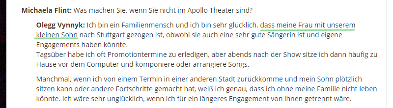 У ньому музикант, як ніколи щиро розповідає про те, що має дружину та сина і мріє з ними переїхати в Штутгарт. У ході розмови співак повідав, що його кохана також займається музикою. Через деякий час українці запідозрять, що головною жінкою в житті повелителя вовчиць є його бек-вокалістка Таюне, а його син Юліан залишився в Німеччині.