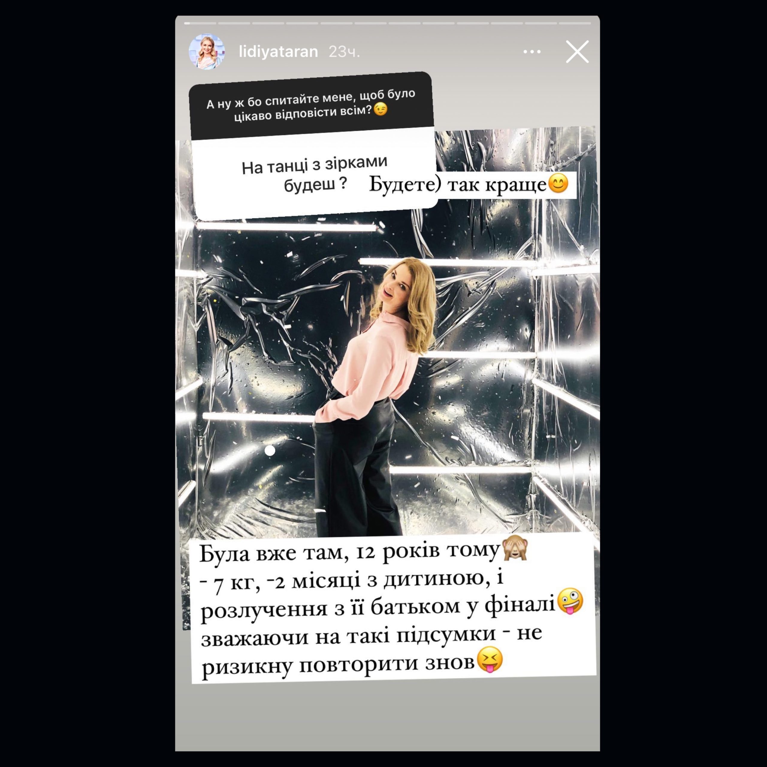 Нещодавно Лідія Таран запропонувала своїм підписникам на особистій сторінці в соціальній мережі Instagram поставити їй будь-які питання. Одна з користувачок вирішила поцікавитися, чи збирається телеведуча брати участь у новому сезоні “Танців з зірками”. І відповідь була неочікувано відвертою.