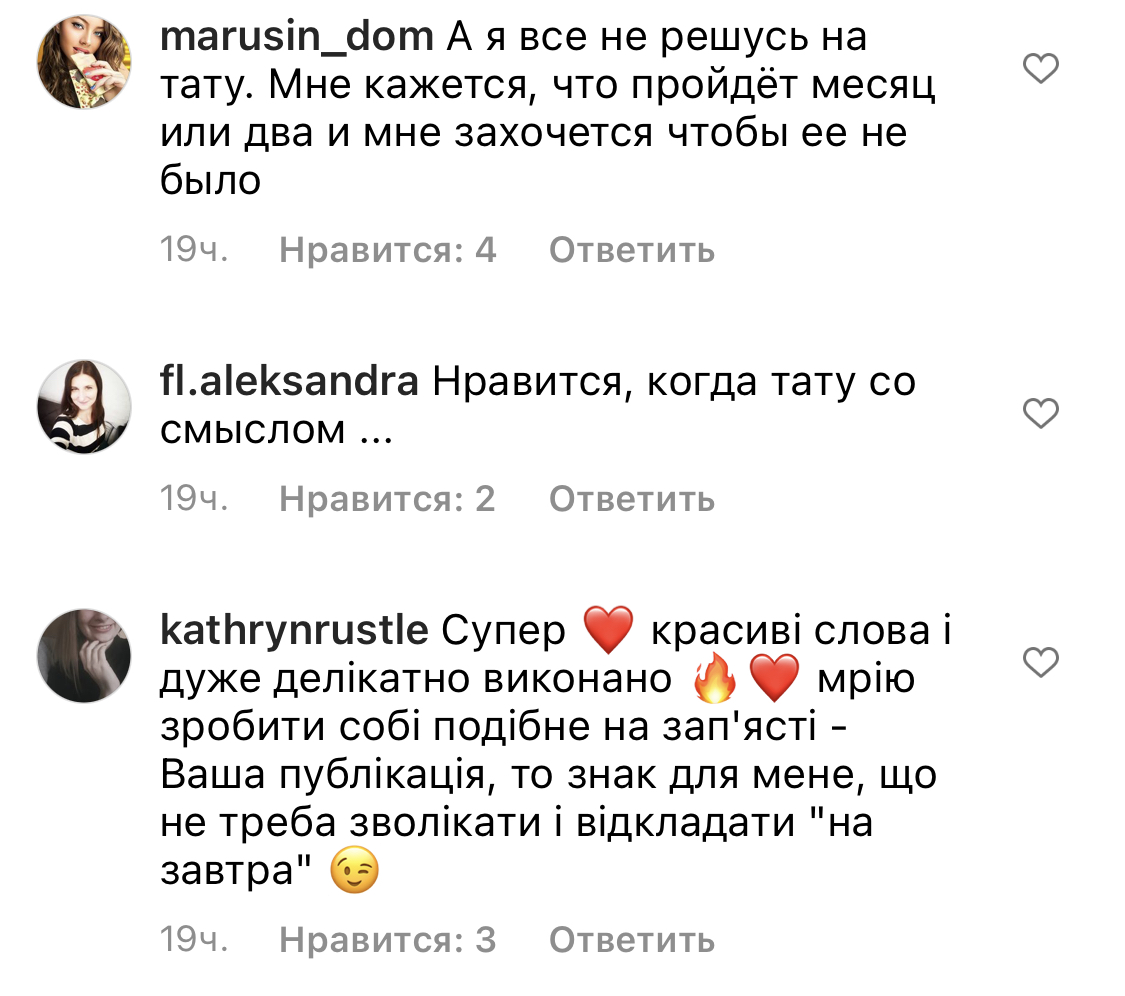 Спеціально для користувачів мережі вона оприлюднила цілу публікацію, для того, щоб пояснити, звідки напис. Виявляється, його зробив учасник четвертого сезону проєкту “МастерШеф” Мілан Котєв. Набита чорною фарбою фраза — це цитата на французькій, яка належить відомій письменниці Анні Гавальді.