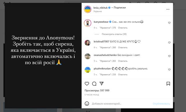 Леся Нікітюк на своїй сторінці в інстаграм попросила хакерів Anonymous при тривозі в Україні включати сирени автоматично та в Росії. Нехай і росіяни відчують, що таке війна!