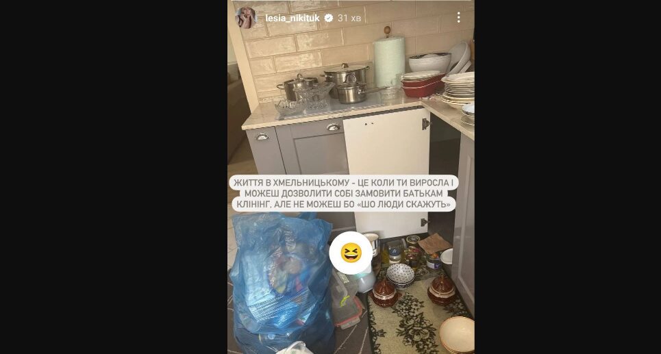 На світлині, яку показала в своєму акаунті Нікітюк – помітна купа посуду та тарілок, мішок зі сміттям і… пластикове відерце з-під якоїсь консервації. Лесі Іванівна в Stories розповіла, що батьки хоч і їдять лише з трьох тарілок – на кухні їх все одно ціла купа. Пластикове ж відерце взагалі чіпати не можна – бо для старшого покоління воно є найціннішим атрибутом.