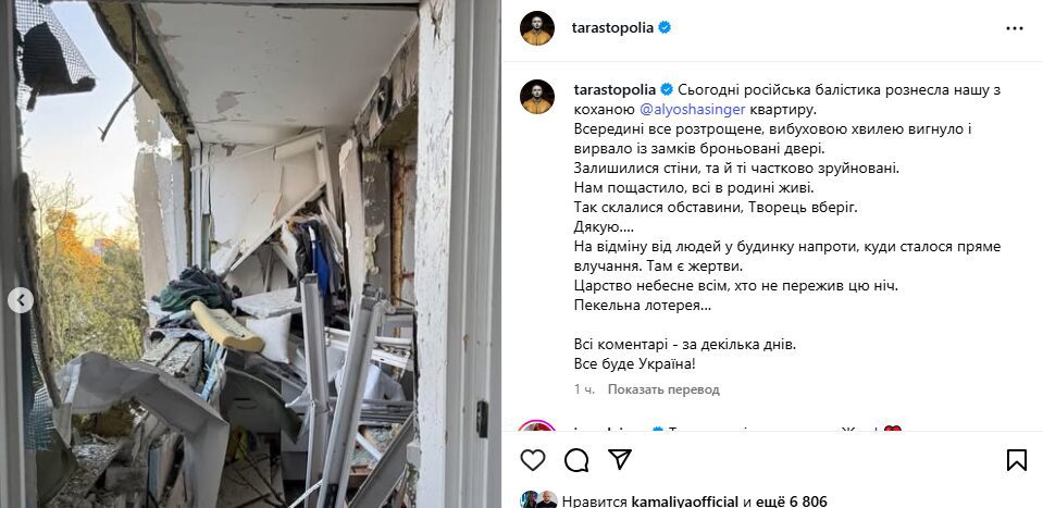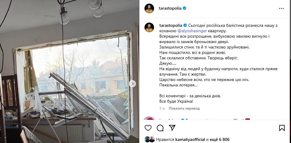 Артист зауважив, що людям в сусідньому будинку пощастило менше, ніж ним. Туди сталось пряме попадання російської балістики і без жертв не обійшлося. Музикант назвав усе, що відбулося – пекельною лотереєю і пообіцяв дати більш детальні коментарі за кілька днів.