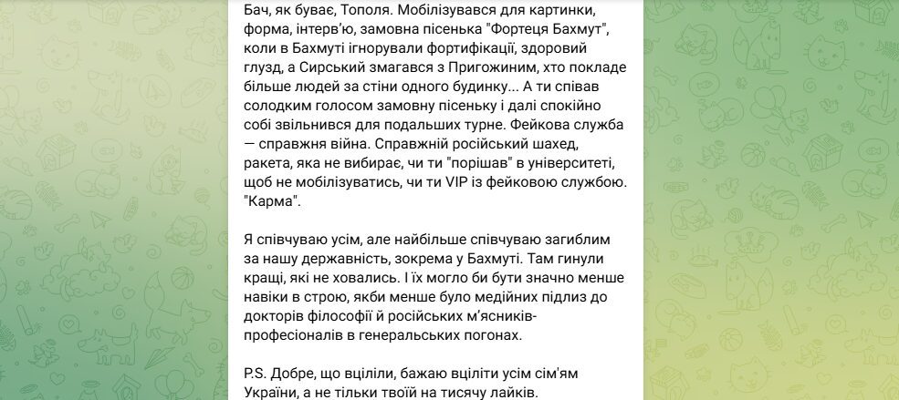 А ось від депутатки Мар’яни Безуглої Тополя отримав порцію критики. На думку жінки, його спіткала… карма. Мовляв би за те, що під час оборони Бахмуту він влаштував показове доєднання до війська та вдяг форму-“піксель”, щоб розкрутити совю нову пісню “Фортеця Бахмут”. На думку Безуглої, ворожі дрони та ракети – це реальність, від якої неможливо взяти відстрочку або звільнення, скориставшись своїми зв’язками в “університеті”. І Тарас Тополя цієї ночі відчув удар карми особисто.