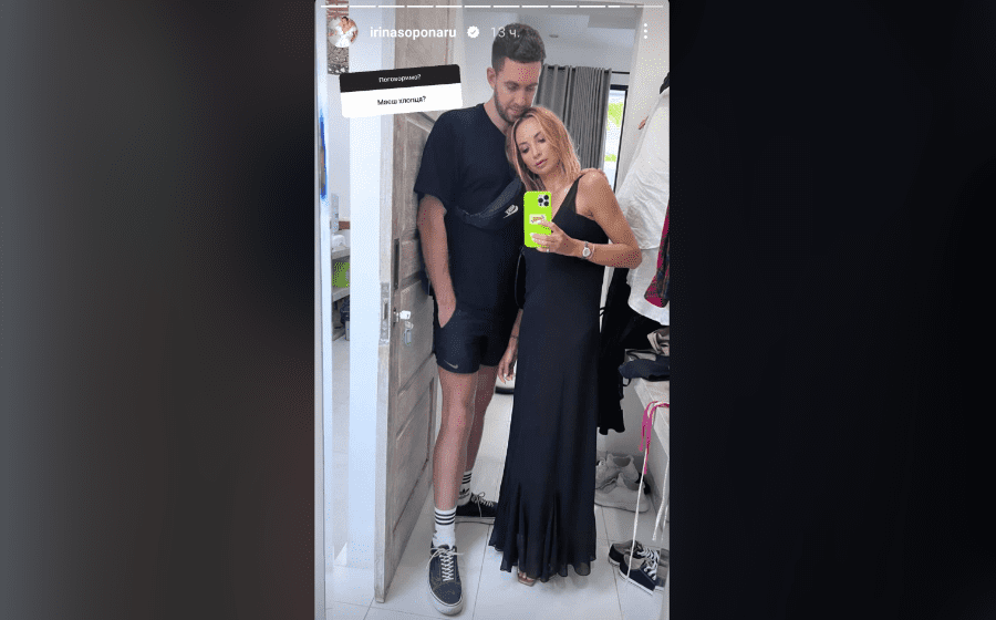 Ірина Сопонару була вдягнена у повністю чорну, довгу сукню. Доповнити образ вирішила прикрасами на руці, а саме годинником та срібним браслетом. Обранець жінки одягнув чорну футболку, шорти, невелику сумку-бананку бренду “Nike”, чорно-білі кросівки та довгі шкарпетки.