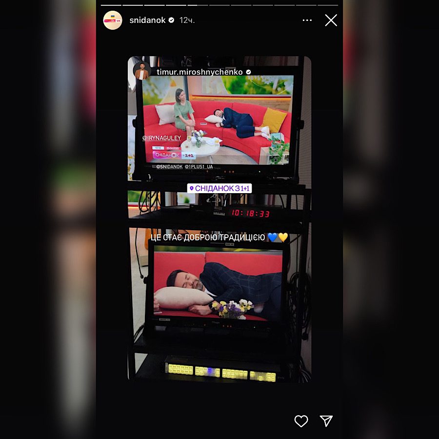 Так, на одному з останніх ефірів “Сніданку з 1+1” Тимур показав фото, де він просто в ефірі лежить на диванчику у студії та спить. Можливо це було заради жарту чи у них була перерва, але фотокартка на якій Мірошниченко спить або дрімає каже сама за себе.