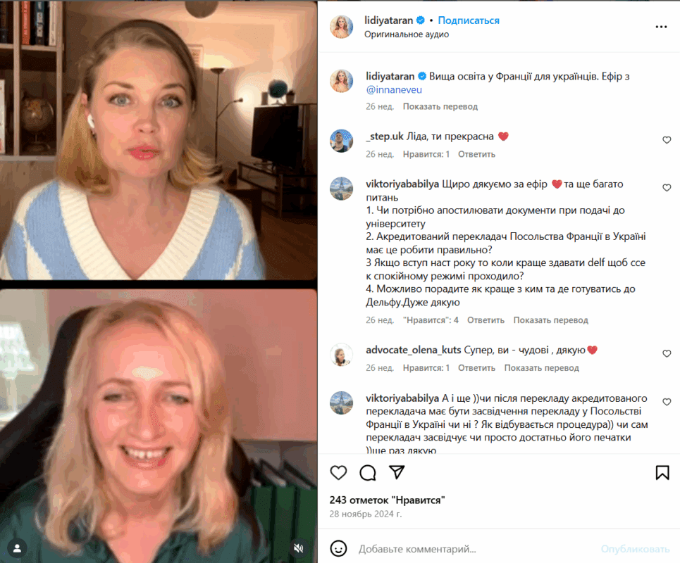 У коментарі в одному зі своїх постів в Інстаграм Таран повідомила, що працює у Франції кореспондентом та висвітлює франко-українські події у містах та селищах європейської країни.