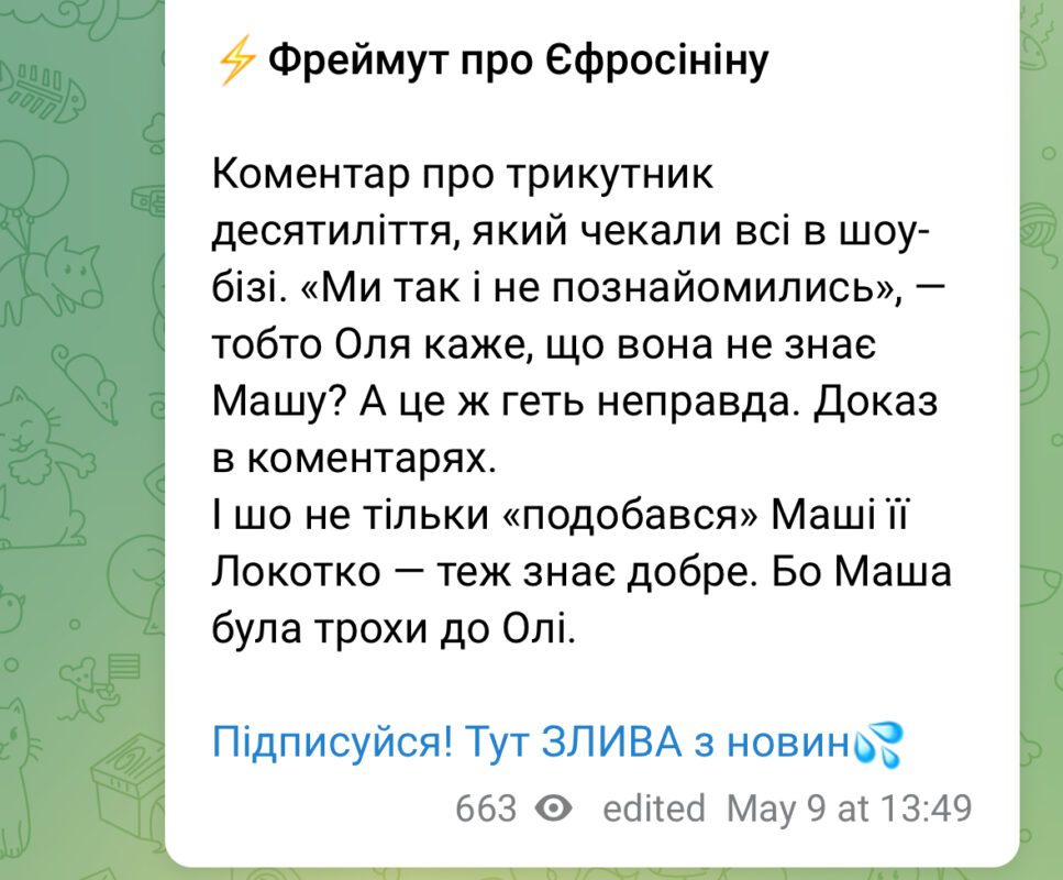 Із цього приводу вже висловилися деякі українські ТГ-канали. “Злива” написали, що слова Фреймут у тому, що мало знайомі з Єфросиніною неправда. І те, що Локотко Єфросініною не лише “подобався” про це Фреймут теж добре знає.