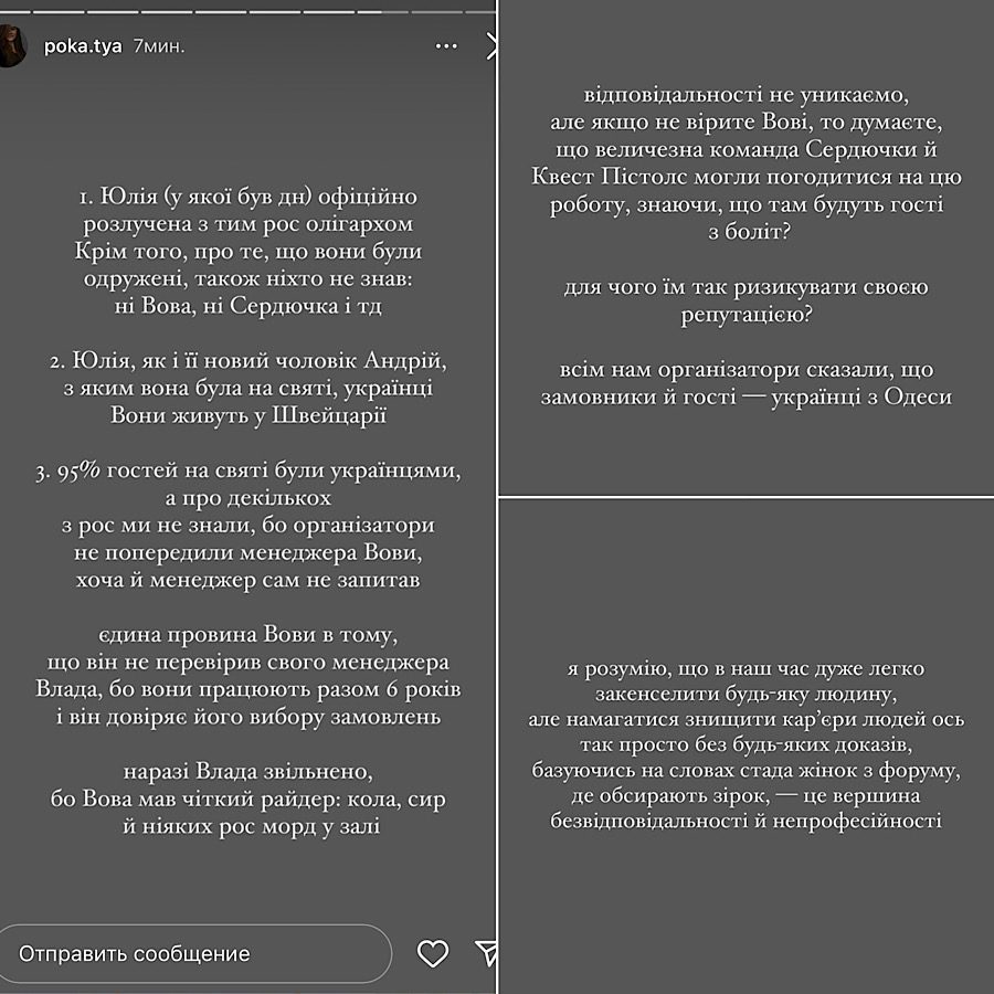 По-перше, Юлія вже розлучена з тим російським олігархом, і про шлюб з ним артисти не знали. Далі Катя сказала, що 95% гостей були українцями. Також згадала про те, що іменинниця з новим чоловіком живе у Швейцарії.
