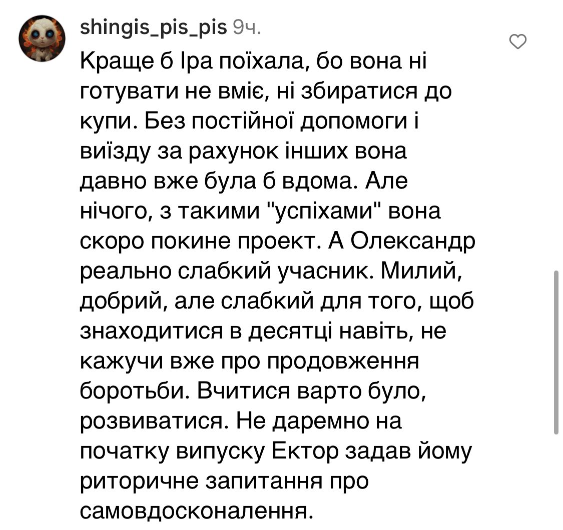 Хоча користувачі і погоджуються, що Олександр — далеко не найсильніший учасник, і все ж таки мріють побачити вилетівшою Ірину чи Валерію.