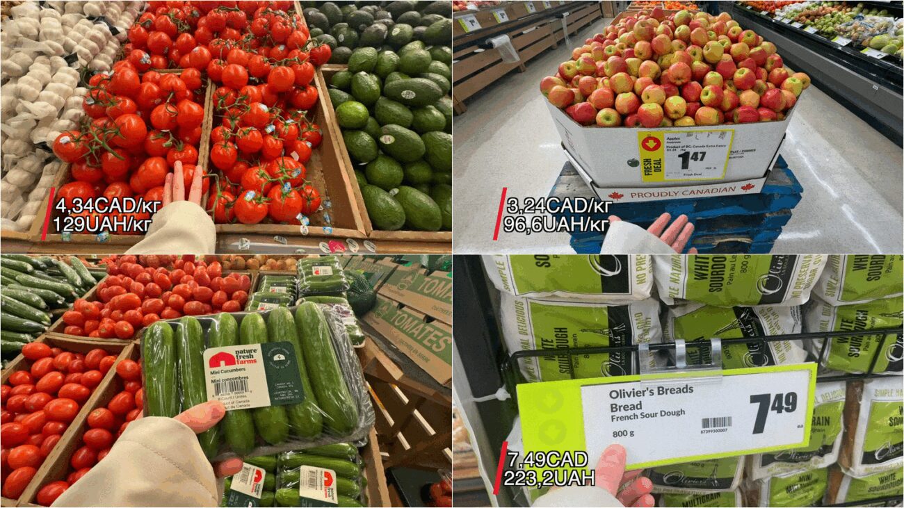Якщо говорити про продукти, то вони в Канаді дорожчі, іноді дорожчі в рази. Наприклад, в Україні за огірки просять близько 11 гривень за кілограм, а в Канаді доведеться заплатити 120 гривень за 6 штук. Томати коштують канадцям від 130 гривень за кілограм. Причому для порівняння бралися найдешевші помідори, які були на полицях, бо там є ще дорожчі — понад 200 гривень за кілограм. В Україні ж томати продаються від 70 грн/кг.